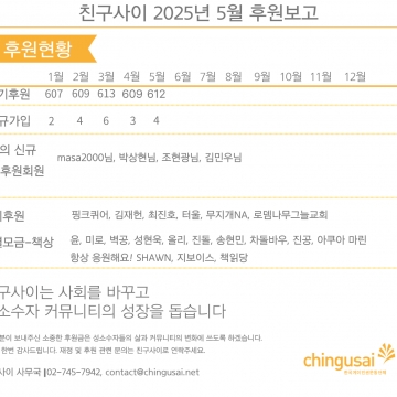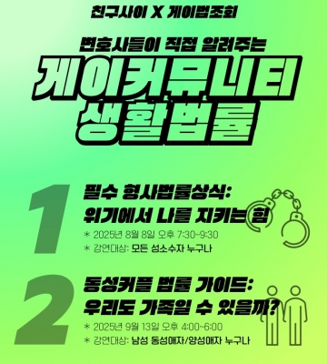 2025 친구사이 송년회 <굿-바이> 진행중 성소수자 사별자 자조 집단 "무지개 너머의 시간" 진행중 올해 마지막 오픈테이블 <HIV를 둘러싼 다양한 ' □□□ ' 를 이야기하는 모임 > 12월모임 마감 2025 친구사이 HIV/AIDS 문화의 밤 마감 [185호][이달의 사진] 첫 번째의 나라에서 온 사람들 [185호][활동보고] 사무실 임대 재계약을 마치고 [185호][커버스토리 "RUN/OUT 프로젝트" #10] 커밍아웃 성소수자 정치인 가능성 찾기: 박한희·세레나 패널 후기 [185호][커버스토리 "RUN/OUT 프로젝트" #11] 커밍아웃 성소수자 정치인 가능성 찾기: 참가자 후기 [185호][커버스토리 "RUN/OUT 프로젝트" #12] 23년 무소속 6선 당선의 기적: 트랜스젠더 가미카와 아야 의원 인터뷰 [185호][커버스토리 "흘리는 연습" #8] 《흘리는 연습》, 또 다른 용기의 시작. [185호][활동스케치 #1] 2025년 하반기 교육프로그램 <친구사이 크루징 투어 - 종로 역사편> 후기 [185호][활동스케치 #2] 트랜스젠더 추모의 날 (TDoR) 집회 참여 후기 [185호][활동스케치 #3] 2025 성소수자 인권활동가대회 : 개연과 당연의 역동, 그리고 필연적인 변화 [185호][소모임] 책읽당 읽은티 #52 : 제10호 문집 발간 기념 낭독회 및 총회 소식지 더보기 후원은 친구사이를 운영하는데 큰 힘이 됩니다. 친구사이의 "특별한" 친구가 되어주세요! 친구사이 후원하기 2025년 귀속 연말정산용 기부금영수증 발급 안내 2025 12-16 2025년을 마무리하며〈올해의 마지막 후원은 친구사이 후원〉 2025 12-15 2025 친구사이 송년회 <굿-바이> 2025 12-10 성소수자 사별자 자조 집단 "무지개 너머의 시간" 2025 12-05