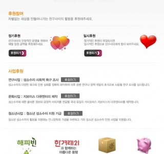친구사이가 온라인 후원 웹페이지를 개편했습니다. 친구사이의 다양하고 편리한 후원방법을 한 눈에 한 페이지에 확인할 수 있습니다. - 정기후원 2005년부터 실...