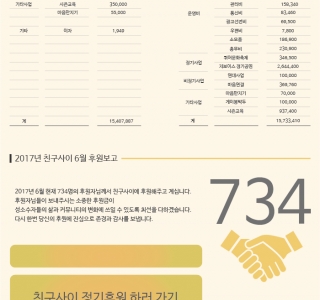 2017년 친구사이 6월 재정보고 *6월 수입 후원금 정기/후원회비: 10,382,275 일시후원: 4,614,600 (일시후원 해 주신 이*하님, 김*현님, 안*민님, 마린보이에 감...