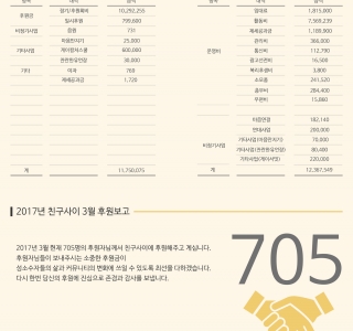 2017년 친구사이 3월 재정보고 *3월 수입 후원금 정기/후원회비: 10,292,255 일시후원: 799,600 (일시후원 해주신 감사합니다) 비정기사업 음원: 731 기타사업 ...
