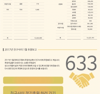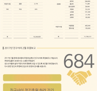 2017년 친구사이 2월 재정보고 *2월 수입 후원금 정기/후원회비: 9,485,165 일시후원: 761,630 (일시후원 해주신 반*님, 이*아님, 민*문님 감사합니다) 비정기사...