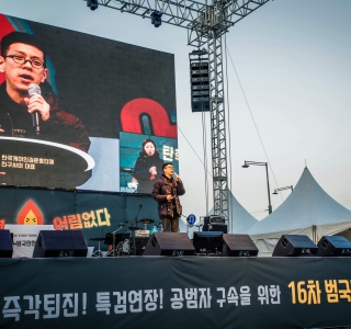 2017년 2월 18일에 있은 박근혜정권 퇴진 비상국민행동 주최 제16차 범국민행동의 날, 무대에 선 김찬영 친구사이 대표의 모습이다. 탄핵정국 아래 개최된 촛불...