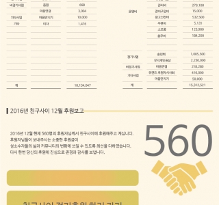 2016년 친구사이 12월 재정보고 *12월 수입 후원금 정기/후원회비: 8,189,775 일시후원: 1,044,090 정기사업 송년회: 880,000 비정기사업 음원: 668 마음연결: 3...