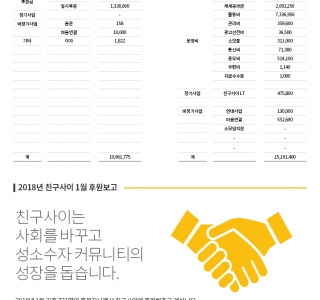 ※ 2018년 친구사이 1월 재정보고 *1월 수입 후원금 정기/후원회비: 9,618,995 일시후원: 1,330,800 (일시후원 해주신 김*석, 최*준님, 주황색 감사합니다) 정기...
