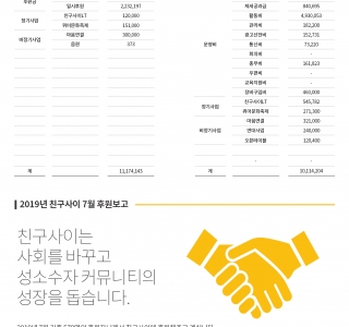 ※ 2019년 친구사이 7월 재정보고 *7월 수입 후원금 정기/후원회비: 8,370,573 일시후원: 2,232,197 정기사업 친구사이 LT: 120,000 퀴어문화축제: 151,000 비정...