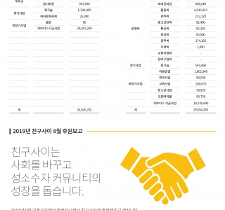 ※ 2019년 친구사이 8월 재정보고 *8월 수입 후원금 정기/후원회비: 8,109,896 일시후원: 953,600 정기사업 친구사이 워크숍: 1,330,000 퀴어문화축제: 25,000 비...