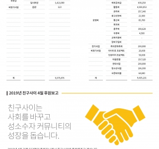 ※ 2019년 친구사이 4월 재정보고 *4월 수입 후원금 정기/후원회비: 7,954,753 일시후원: 1,421,000 비정기사업 음원: 123 총계: 9,375,876 *4월 지출 운영비 임...