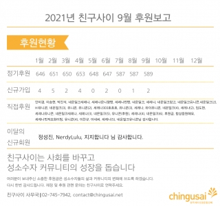 2021년 친구사이 9월 후원보고 2021년 9월 정기후원: 589명 2021년 9월 신규가입: 1명 직접후원: 안미경, 이승현, 박진석, 네온밀크세레나, 세레나온니왕팬, 세...