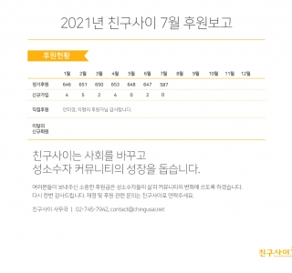 2021년 친구사이 7월 후원보고 2021년 7월 정기후원: 587명 2021년 7월 신규가입: 0명 직접후원: 안미경, 익명의 후원자님 감사합니다. 이달의 신규회원: 친구사...