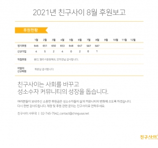 2021년 친구사이 8월 후원보고 2021년 8월 정기후원: 587명 2021년 8월 신규가입: 1명 직접후원: 용인, 멀리서응원해요, 안미경 후원자님 감사합니다. 이달의 신...