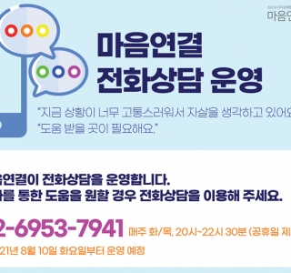 02-6953-7941 (마음연결 전화상담 번호) 성소수자자살예방프로젝트 마음연결이 전화 상담을 시작했습니다. 8월 10일부터 매주 화요일과 목요일 오후 8시~오후 10...