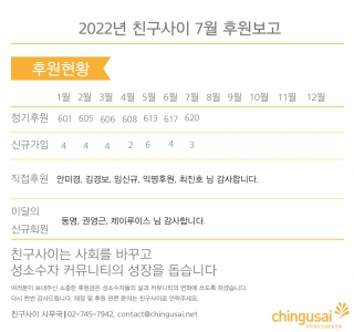 2022년 친구사이 7월 후원보고 2022년 7월 정기후원: 620명 2022년 7월 신규가입: 3명 직접후원: 안미경, 김경보, 임신규, 익명후원, 최진호 님 감사합니...