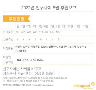 2022년 친구사이 8월 후원보고 2022년 8월 정기후원: 620명 2022년 8월 신규가입: 2명 직접후원: 최진호, 안미경, 익명후원, 김경보, 실용퀴어, 로뎀나무그늘교...