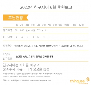 2022년 친구사이 6월 후원보고 2022년 6월 정기후원: 617명 2022년 6월 신규가입: 4명 직접후원: 익명후원, 안미경, 김경보, 지부원, 호랭이, 임신규, 익...