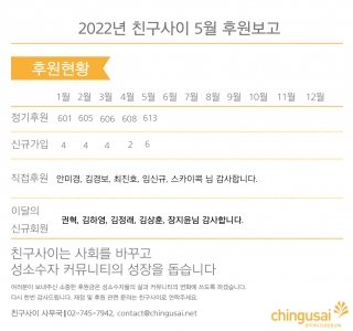 2022년 친구사이 5월 후원보고 2022년 5월 정기후원: 613명 2022년 5월 신규가입: 6명 직접후원: 안미경, 김경보, 최진호, 임신규, 스카이콕 님 감사합니...