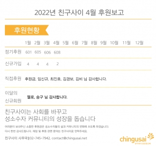 2022년 친구사이 4월 후원보고 2022년 4월 정기후원: 608명 2022년 4월 신규가입: 2명 직접후원: 후원금, 임신규, 최진호, 김경보, 김비 님 감사합니다. 이달의 ...