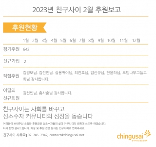 2023년 친구사이 2월 후원보고 2023년 2월 정기후원: 642명 2023년 2월 신규가입: 2명 직접후원: 김경보님, 김선빈님, 실용퀴어님, 최진호님, 임신규님, 한윤하...