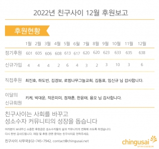 2022년 친구사이 12월 후원보고 2022년 12월 정기후원: 638명 2022년 12월 신규가입: 6명 직접후원: 최진호, 하도빈, 김경보, 로뎀나무그늘교회, 김동표, ...