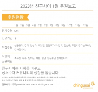 2023년 친구사이 1월 후원보고 2023년 1월 정기후원: 644명 2023년 1월 신규가입: 6명 직접후원: 실용퀴어, 강아, 남성호, 책읽당, 망원댁TV와 망고, 임신규, 로...