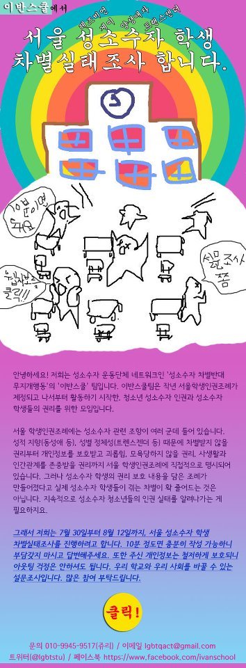 안녕하세요! 저희는 성소수자 운동단체 네트워크인 '성소수자 차별반대 무지개행동'의 '이반스쿨' 팀입니다. 이반스쿨팀은 작년 서울학생인권조례가 제정되고 나서부터 활동하기 시작한, 청소년 성소수자 인권과 성소수자 학생들의 권리를 위한 모임입니다.