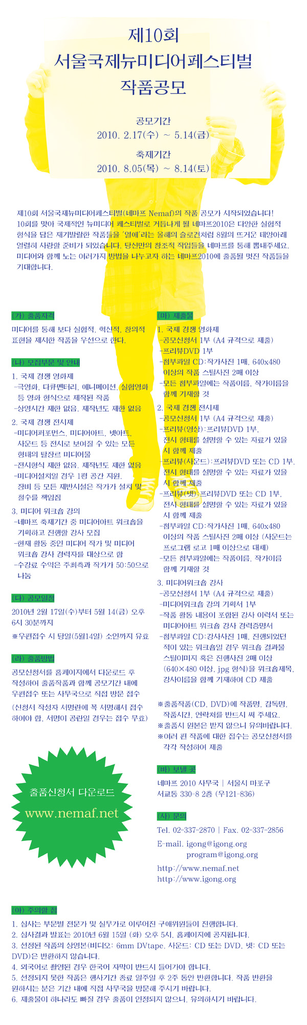 » 제10회 서울국제뉴미디어페스티벌 작품공모-영화,... 아이공 2010-04-21 538