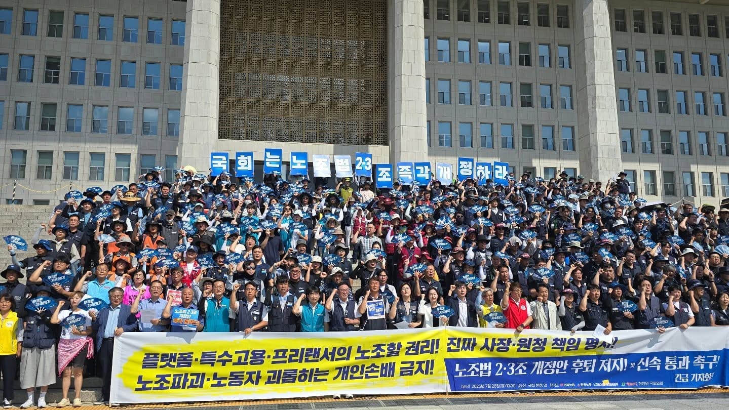 올해 7월, 정부 주도 아래 노조법 개정안에 대한 수정안이 논의되었습니다. 노동쟁의의 범위를 축소하고 개정안 시행을 1년 이상 유예하는 등, 이전보다 후퇴한 내용이 검토 중인 것으로 알려졌습니다. 이에 양대노총과 시민들은 노조법 후퇴시도를 저지하고자 국회 앞에서 농성과 집회를 이어갔습니다. 결국, 정부의 수정안을 철회시켰고, 노조법 개정안은 오는 8월 4일 국회 본회의 통과를 앞두고 있습니다. 다만, 이번에 통과예정인 노조법 개정안 또한 앞에서 언급했듯, 노동자추정조항과 손해배상 금지가 반영되지 않았기 때문에, 노동자들의 권리를 보장하기에는 턱없이 부족합니다. 차별과 무권리 상태의 노동에서 벗어나기 위한 더욱 치열한 싸움이 필요한 것이지요.